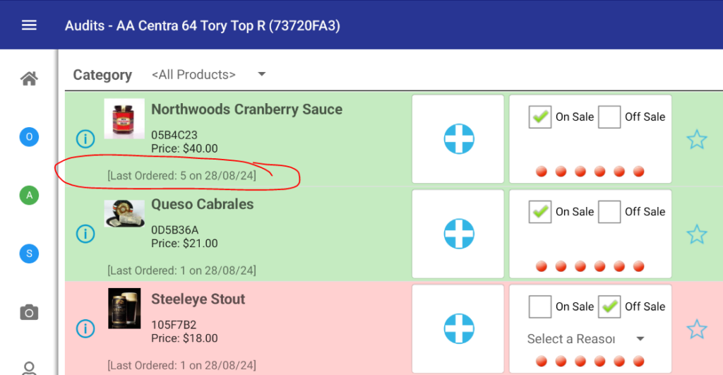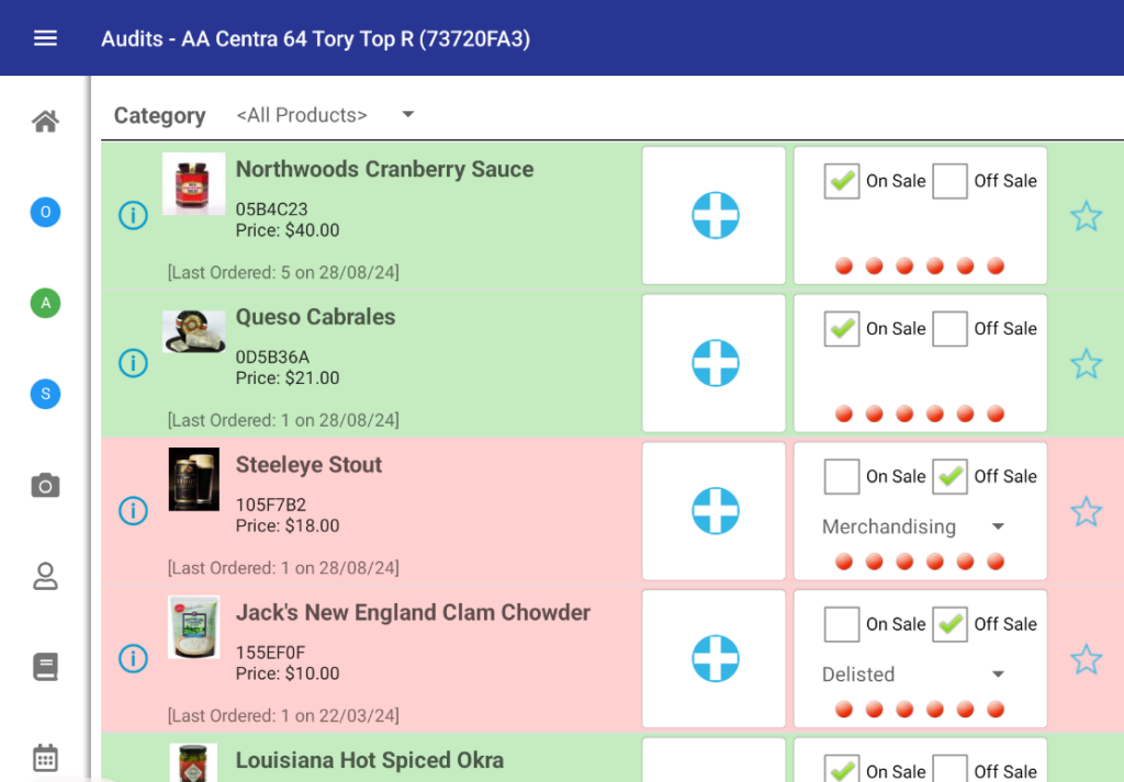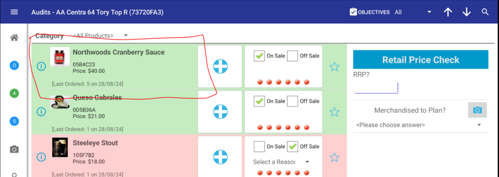 4. On-Sale lines marked Green, Off-Sale lines marked red . . helps increase efficiency and eliminate errors in the Audit process: