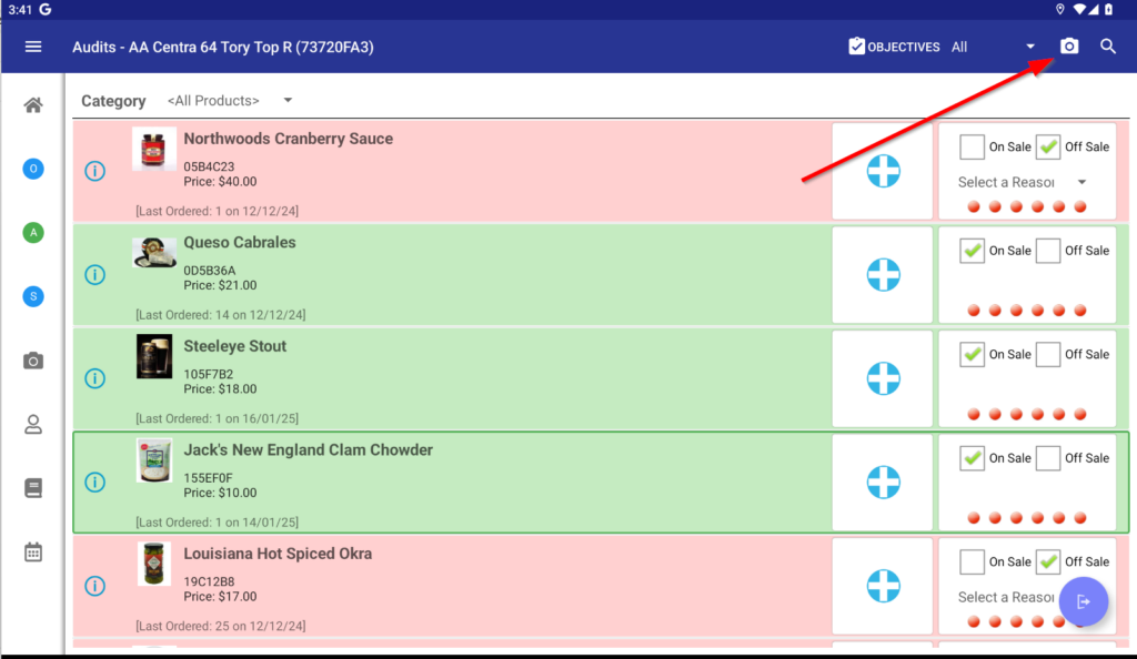 Photo capture during an audit can be accessed by tapping on the camera icon: