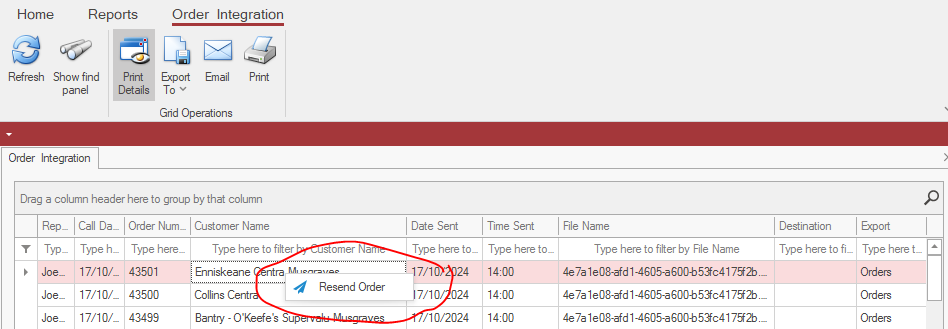 To resend an order, go to Troubleshooting/Order Integration on your console.